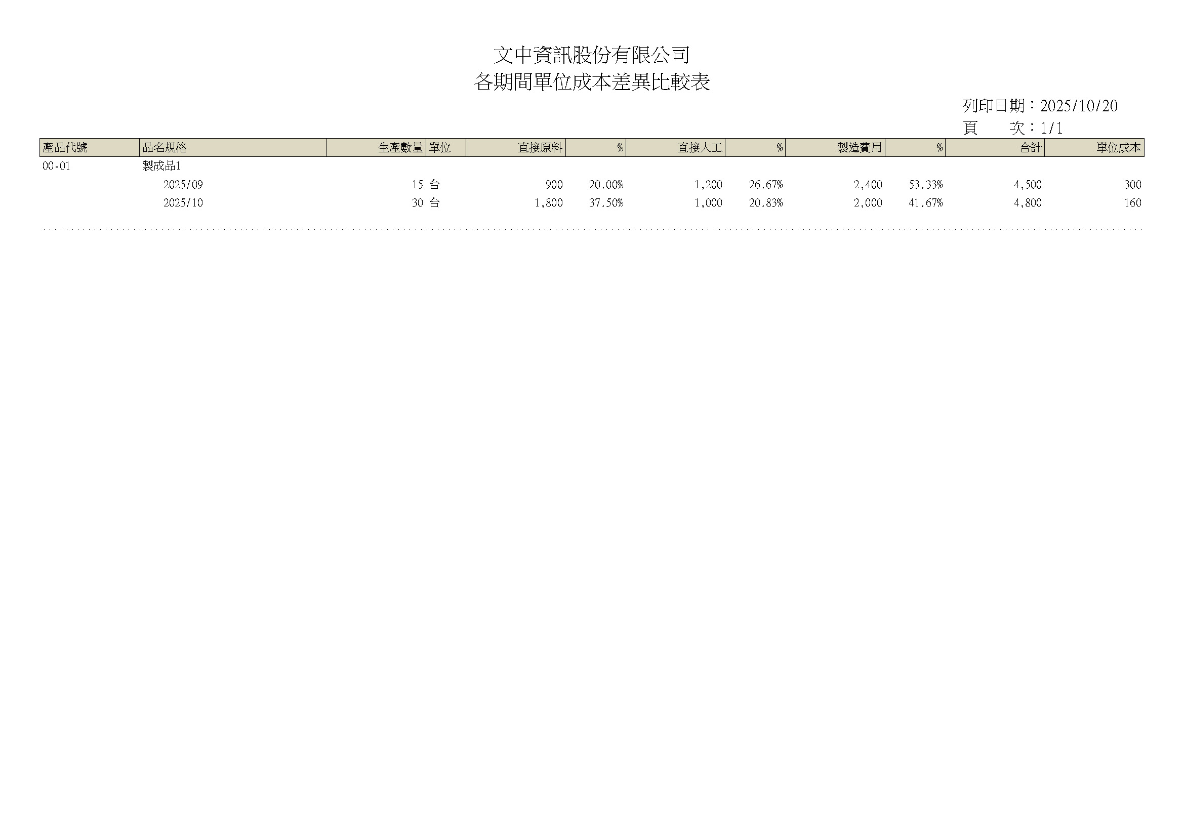 各期間單位成本差異比較表